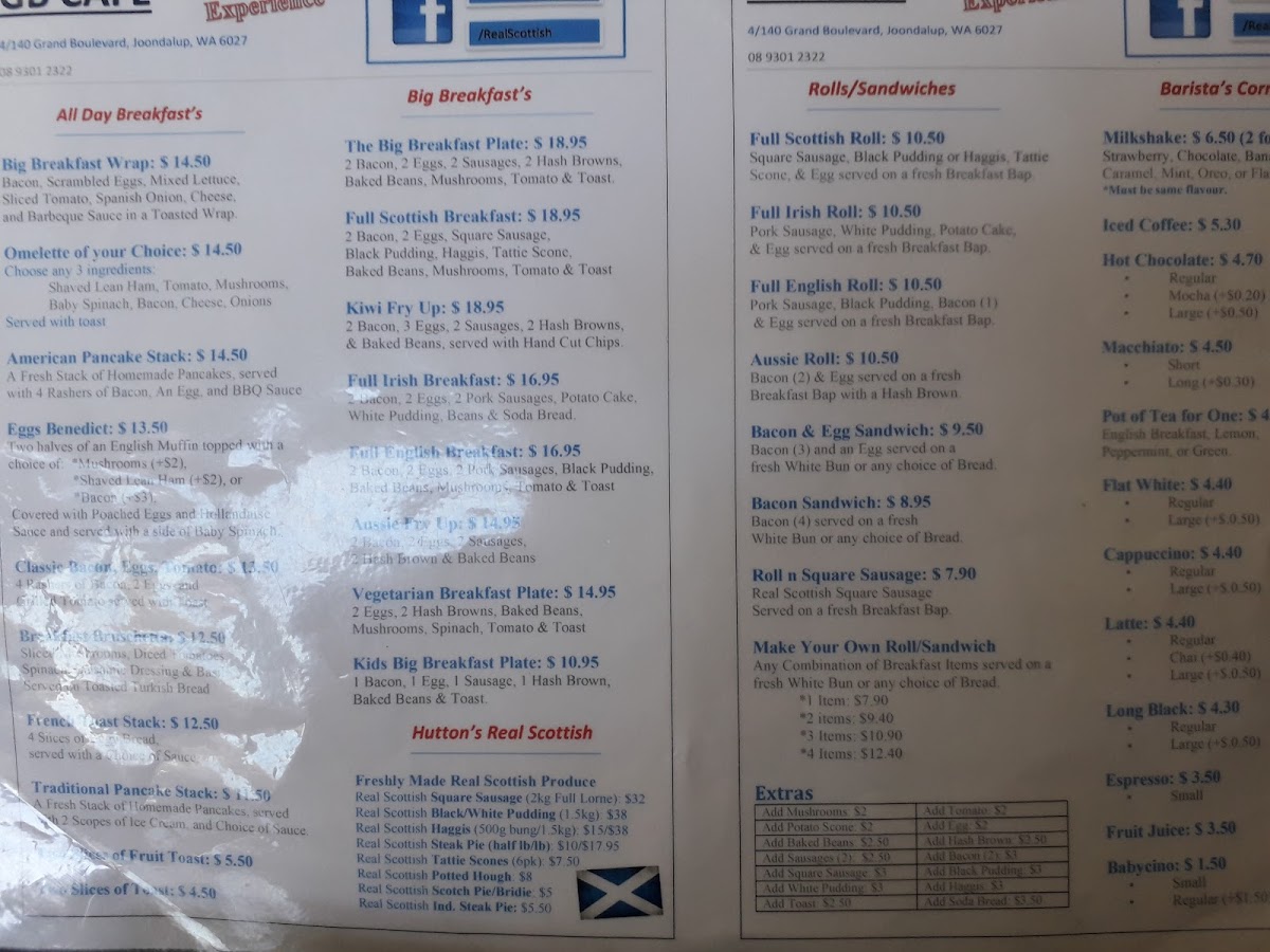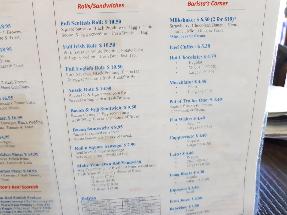 Guests often start their day enjoying warm, satisfying dishes like the Full Scottish Breakfast or a stack of American pancakes. For something quick yet substantial, the variety of rolls—such as the Full Irish Roll or the Aussie Roll—makes for a fulfilling snack or light meal throughout the day. The menu also includes comforting extras like pies and sausages that pair well with a robust coffee or a pot of tea.